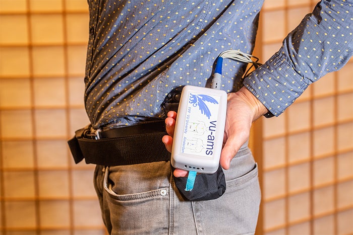 The VU-AMS is an ambulatory monitoring system designed for non-invasive continuous measurement of autonomic nervous system activity to assess exposure to stress in real life. It combines electrocardiogaphy (ECG), impedance cardiography (ICG), electrodermal activity (EDA) and triaxial accelerometry measurement into an easy to use, light-weight, battery-operated device.
